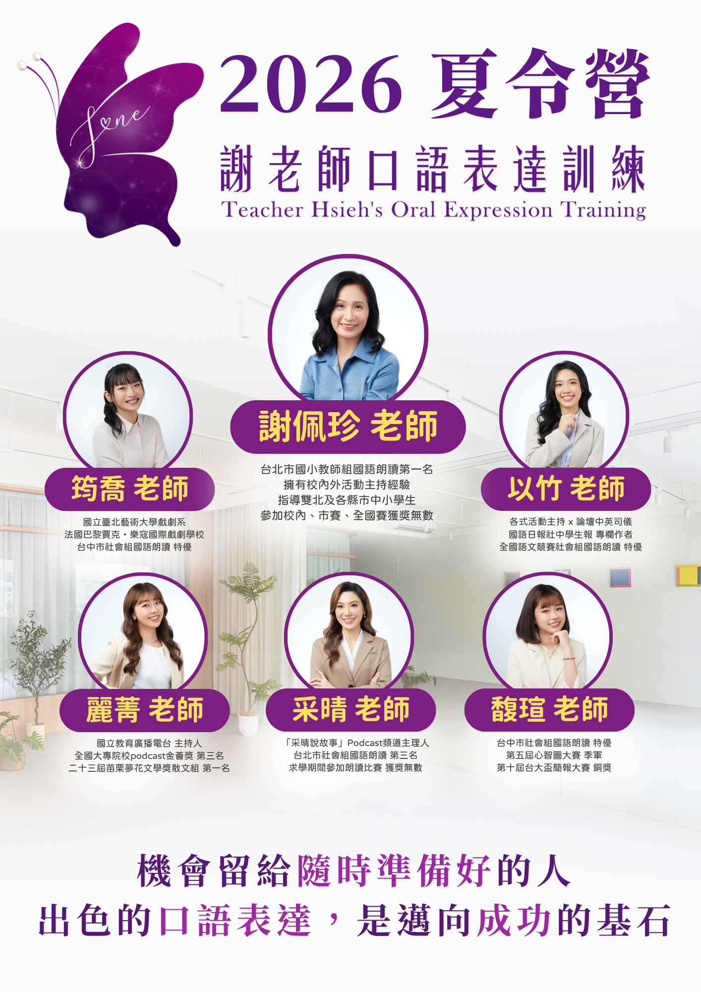 口語訓練就是要培養具有膽識與自信,說話有邏輯、有內容、有力道的人才。兒童口語表達訓練課程、朗讀比賽技巧訓練、演說比賽技巧訓練、說故事比賽、發音咬字矯正、正音班、詞彙發想運用、表情及肢體訓練、增進表達邏輯能力、培育品格及人文素養。孩子要參加朗讀比賽、演說比賽卻不知該從何下手嗎? | 謝老師傳授專業的演說、朗讀技巧及比賽規則,教您如何用正確的發音、和諧的語調、流暢而自然地讀出文句中的情意,藉由朗讀不同的文體,學習掌握情緒的表現;朗讀|演說|朗讀比賽|演說比賽|朗讀技巧|演說技巧|即席演說|說故事比賽|發音咬字|上台自信|上台報告|天母謝老師口語表達訓練班|朗讀演說|口語表達|口語表達訓練|演說訓練|朗讀訓練|兒童口語表達|兒童說話技巧|朗讀老師|朗讀指導|演說指導|天母謝老師口語表達訓練班|演說朗讀展能口語表達、朗讀比賽、朗讀技巧、演說比賽、多語文競賽、朗讀比賽文章、演說比賽題目、咬字發音、正音、國小朗讀、國小演說